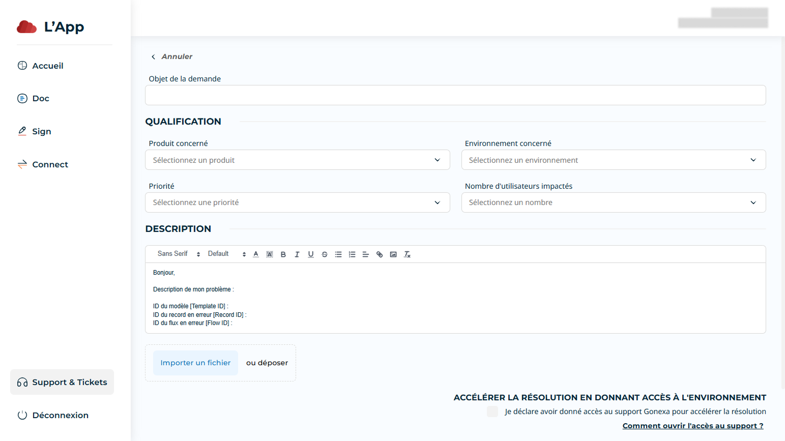 Cochez la case “Je déclare avoir donné accès au support Gonexa pour accélérer la résolution” si vous avez bien ouvert l’accès au support sur l’environnement concerné.