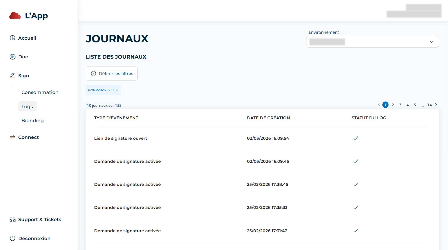 Cette section dédiée vous permet d’accéder à l’historique complet des journaux liés aux envois en signature, avec un suivi détaillé et un statut.