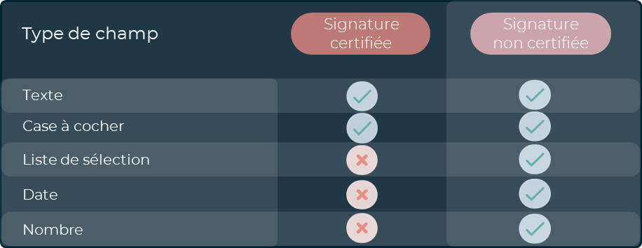 Avant de configurer vos interactions, vérifiez la compatibilité des types de champs selon votre niveau de signature :